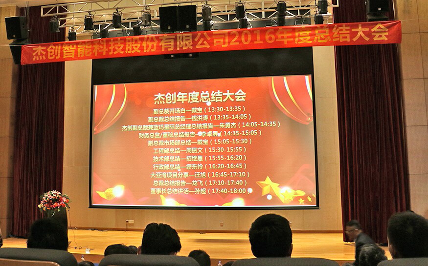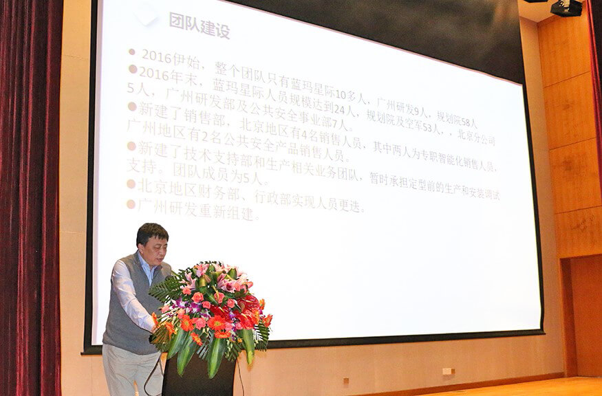 总结大会上,在公司副总裁戴宝先生激情洋溢的开场白后,副总裁钱洪涛先生、东升国际智能董事兼蓝玛星际总经理朱勇杰先生、财务总监兼董秘李卓屏女士、副总裁戴宝先生、工程部总监周振文先生、技术部总监招继恩先生、行政部总监缪东伶女士、工程部副总监汪旭先生、总裁龙飞先生先后登台,分别做了2016年度工作总结。