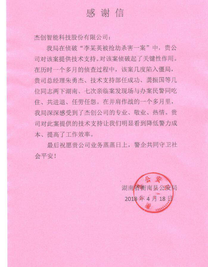 近日,湖南省衡南公安局发来感谢函,对东升国际智能在近期协助侦破“李某英被抢劫杀害一案”表示感谢,目前相关犯罪嫌疑人已被依法刑事拘留,案件正在进一步侦办中。